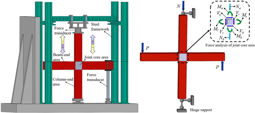 In reinforced concrete frame structures, a beam-column joint is inherently a three-dimensional structural component subjected to complex stress states. To facilitate force analysis and model formulation, the restraining effect of the floor slab is neglected in this study. The beam end and column end are defined as the segments extending from the corresponding inflection points to the joint interface, thereby transforming the spatially complex joint region into an equivalent two-dimensional member within a planar frame system. Based on this simplification, the boundary conditions and force state of the beam-column joint subjected to beam-end loading can be clearly defined. The corresponding mechanical model and force analysis of the simplified joint are illustrated in Figure 1.