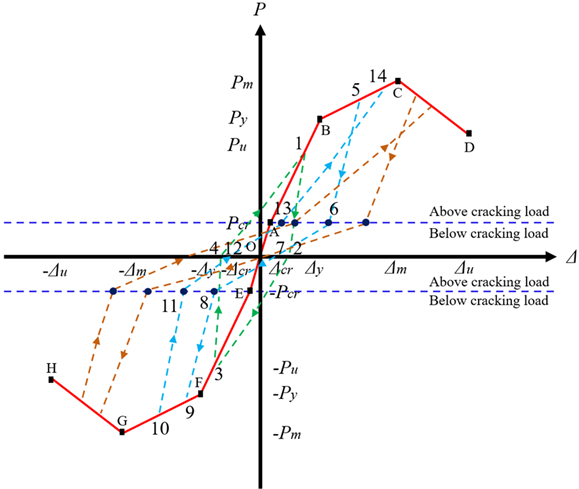 When the applied load further exceeds the yielding point and the member enters the peak stage, spanning from point B to point C, the unloading path is divided into two segments by an inflection point, as shown by path \(5\rightarrow6\rightarrow7\). The unloading stiffness is calculated separately for each segment, with the cracking load serving as the division criterion: Eq. (42) is applied for segment \(5\rightarrow6\), while Eq. (48) is used for segment \(6\rightarrow7\). During reverse reloading, the reloading path also consists of two segments divided by an inflection point, following paths \(7\rightarrow8\) and \(8\rightarrow9\). The reloading stiffness is evaluated separately for each segment, with Eq. (45) applied to segment \(7\rightarrow8\) and Eq. (49) to segment \(8\rightarrow9\). After reloading to point 10, subsequent unloading and reloading follow paths \(10\rightarrow11\rightarrow12\) and \(12\rightarrow13\rightarrow14\), respectively, until a complete hysteretic loop is formed. The stiffness values throughout this process are calculated using the corresponding equations. The complete hysteretic path in this stage is \(5\rightarrow6\rightarrow7\rightarrow8\rightarrow9\rightarrow10\rightarrow11\rightarrow12\rightarrow13\rightarrow14\).
