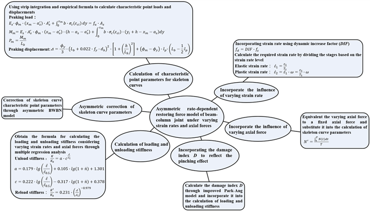 Among diverse restoring force models, curvilinear types demonstrate high accuracy but are characterized by structural complexity that hinders practical application. Consequently, polyline models are more widely adopted in engineering due to their computational efficiency and adequate accuracy [14, 15]. Therefore, considerable research has been dedicated to developing polyline models for predicting the mechanical behavior evolution of beam-column joint. For instance, Yu et al. [16] proposed a flat-topped trilinear model derived through theoretical analysis, which effectively characterized the load-displacement relationship across various loading stages. Nevertheless, the descending branch of the skeleton curve, limiting its accuracy beyond the ultimate load, and assumes a symmetric skeleton curve is neglected in this model, whereas actual member responses frequently exhibit asymmetry [17]. To overcome these limitations, Yu et al. [18] established an asymmetric trilinear model calibrated with experimental data, incorporating an ultimate strength point to represent the descending branch and thereby improving predictive accuracy. However, this model was developed confined to quasi-static loading and a fixed axial force, neglecting the effects of varying strain rates or axial forces, which were critical factors influencing the mechanical behaviors [19]. Following a similar methodology, Pang et al. [20] developed an asymmetric trilinear model via regression analysis. Although external strengthening effects were considered, the influences of varying strain rates and axial forces were overlooked. For further refinement, Xue et al. [21] proposed a quadrilinear model that includes a cracking point and employs normalized parameters, considering the stiffness-improving contribution of the slab. Although this model more accurately simulates the actual loading process compared to trilinear formulations, it similarly neglects varying strain rates and axial forces, while failing to adequately represent pinching behavior in hysteretic curves. To address this specific issue, Zhuang et al. [22] defined multiple inflection and compression points into a quadrilinear model, generating hysteretic curves that align better with experimental observations. However, this model also fails to incorporate the effects of varying strain rates and axial forces. Despite the abundance of restoring force models, an appropriate asymmetric model remains lacking for analyzing beam-column joint mechanical properties under complex dynamic loads characterized by coupled variations in strain rates and axial forces.