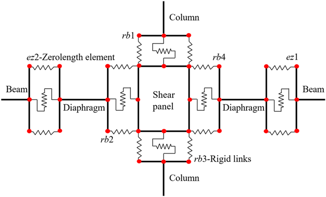 Incorporating the restoring force model proposed in section 3, a finite element model of the beam–column joint is developed in OpenSees to predict its dynamic mechanical performance. In the numerical model, the “Concrete02” and “Steel02” material models are employed to represent the constitutive behavior of concrete and reinforcement, respectively. The joint shear panel is depicted through four “RigidLink” commands (denoted as rbi, \(i=1\)–4), which ensure the rigid connection within the panel. The beam-end is connected to the shear panel via “ZeroLength” elements (\(ezi\), \(i=1,2\)), enabling precise simulation of the connection behavior. To reproduce the hysteretic response of the beam–column joint, the “Pinching4” material model is adopted. The parameters of this material are calibrated based on the proposed restoring force model, including the characteristic points of the skeleton curve, the loading and unloading stiffness, and the damage indices. The overall finite element model configuration is illustrated in Figure 12.