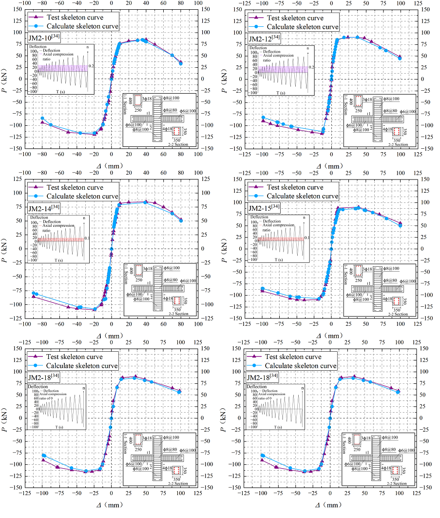 According to the established method for evaluating plastic displacement, the plastic component is primarily governed by the length of the plastic hinge zone. To incorporate the influence of varying axial force into the restoring force model, based on a commonly adopted empirical expression, the formula for calculating the length of the plastic hinge zone \(l_p\), while considering the influence of the axial compression ratio, is expressed as follows: \[l_p=2(h-a_s)\left[1-\frac{0.5(\mu_s f_{yt}-\mu_{sc}f_{yc}+N_1/bh)}{f_c}\right], \label{eq24} \tag{24}\] where \(\mu_{st}\) and \(\mu_{sc}\) are the tensile and compressive reinforcement ratios, respectively; \(f_{yt}\) and \(f_{yc}\) are the yield strengths of the tensile and compressive reinforcement; \(N_1\) is the axial force; \(f_c\) is the compressive strength of concrete.