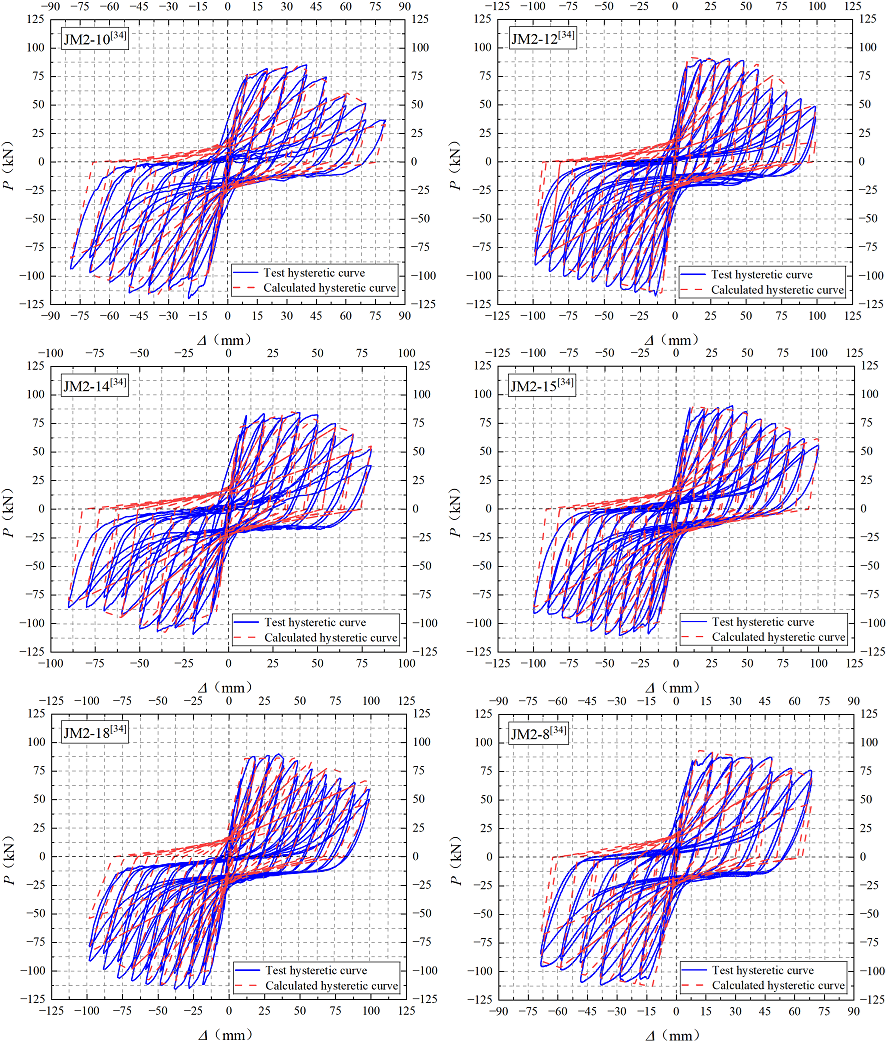 Comparisons between the calculated and test hysteretic curves are shown in Figure 14. Overall, good agreement is observed between the two sets of results. The calculated hysteretic curves accurately predict the shear capacity of the beam–column joint under dynamic loading and effectively reproduce key hysteretic characteristics, including strength degradation, stiffness degradation, and pinching behavior. Prior to reaching the peak strength, the calculated load–displacement responses closely match the test results, indicating that the restoring force model reliably captures the stiffness characteristics of the ascending branch. After the peak strength point, however, some calculated curves exhibit relatively larger deviations from the test results. This discrepancy can be attributed to the adoption of an empirical value of \(0.85P_m\), derived from quasi-static tests, as the ultimate load in the skeleton curve, whereas the actual ultimate load under dynamic loading conditions shows greater variability. Nevertheless, the overall agreement between the calculated and test hysteretic curves remains satisfactory, confirming that the proposed restoring force model is capable of effectively simulating the hysteretic behavior of beam–column joints subjected to dynamic loading.