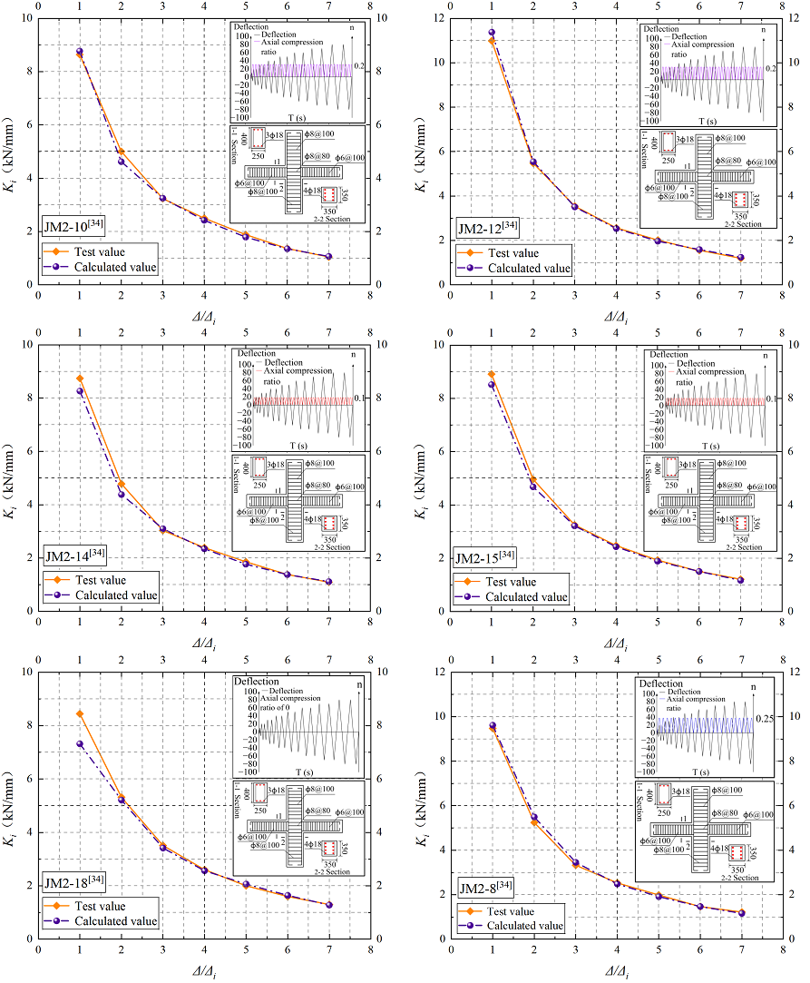 The variation trend of reloading stiffness at different loading stages is generally consistent with that of unloading stiffness. Nevertheless, the influence of varying strain rates and axial forces on the reloading stiffness is relatively small and can be neglected for the sake of computational simplicity. Therefore, the reloading stiffness \(K'\) after the cracking point is calculated using the original model expression. \[\frac{K'}{K}=0.231\left(\frac{\Delta}{\Delta_i}\right)^{-0.979}. \label{eq45} \tag{45}\]
