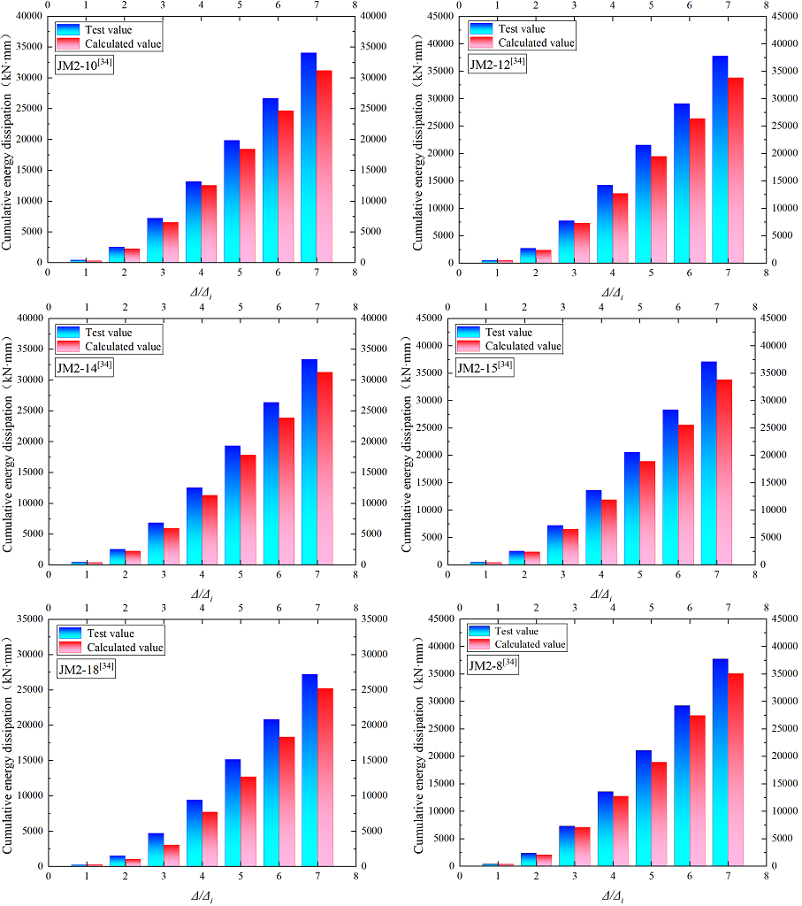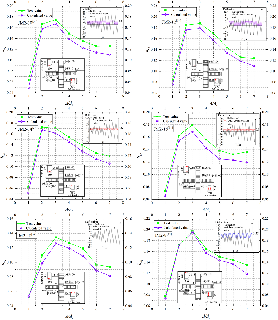 Figures 16 and 17 present comparisons of the cumulative energy dissipation and the equivalent viscous damping coefficient, respectively, to assess the model’s ability to predict the energy dissipation capacity of the member. The calculated cumulative energy dissipation at each displacement amplitude shows close agreement with the test results, although most calculated values are slightly lower than the test data. The maximum and average errors are \(13.17\%\) and \(8.80\%\), respectively, both within an acceptable range. Similarly, the equivalent viscous damping coefficient obtained from the model exhibits a high level of consistency with the test values, with maximum and average errors of \(13.83\%\) and \(8.11\%\), respectively. As shown in Figure 17, the calculated equivalent viscous damping coefficient curve closely follows the test curve during the early loading stage, while a modest deviation appears in the later stage. This deviation is mainly attributed to the fact that the hysteretic behavior in the model is derived from multiple regression analysis, which introduces inherent discrepancies in the hysteretic loop area that become more pronounced as the displacement amplitude increases. Overall, the energy dissipation parameters predicted by the proposed restoring force model show good agreement with the test results, demonstrating that the model can effectively evaluate the energy dissipation capacity of beam–column joints under dynamic loading.