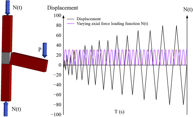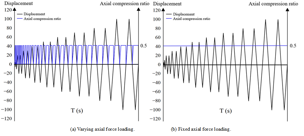 According to the loading protocol specified for database No. 88–101 in [34], displacement-controlled loading was applied at the beam end, while the column end was subjected to either fixed or varying axial force. The maximum axial compression ratio was set to 0.5, and the corresponding loading schemes are summarized in Table 4. Under varying axial force conditions, the axial force increased with the beam-end displacement within each loading cycle. When the beam-end displacement reached the target amplitude, the column end maintained the maximum axial force until the beam returned to its initial position, after which the axial force was reduced to zero, completing one loading cycle. This axial force variation pattern was repeated in subsequent cycles, as illustrated in Figure 19(a).