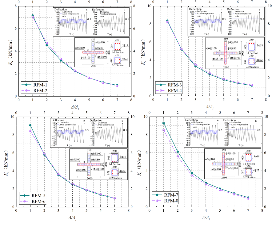 Stiffness degradation, which reflects the accumulation of damage under cyclic loading, is evaluated for the beam–column joint under varying strain rates and axial forces using the secant stiffness. The secant stiffness is defined as: \[K_i=\frac{\left|F_i^{+}\right|+\left|F_i^{-}\right|} {\left|\Delta_i^{+}\right|+\left|\Delta_i^{-}\right|}, \label{eq51} \tag{51}\] where \(F_i^{+}\) and \(F_i^{-}\) are the positive and negative peak loads at the \(i\)-th displacement amplitude, while \(\Delta_i^{+}\) and \(\Delta_i^{-}\) are the corresponding positive and negative peak displacements.