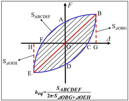 The equivalent viscous damping coefficient \(h_{eq}\) quantifies the energy dissipation efficiency associated with the shape of the hysteretic loop. To comprehensively evaluate the energy dissipation capacity of beam–column joints under varying strain rates and axial forces, \(h_{eq}\) is combined with the cumulative energy dissipation. The relevant formulations and corresponding curves are shown in Figures 24 and 25, respectively. When subjected to varying axial force, \(h_{eq}\) exhibits a slight decrease across all displacement amplitudes compared to the fixed axial force, with reduction ranging from \(1.91\%\) to \(12.5\%\). Meanwhile, the curves corresponding to the two axial force conditions display a high degree of similarity. Combined with the cumulative energy dissipation results discussed above, this indicates that varying axial force has a limited influence on the overall energy dissipation capacity. As the strain rate increases, \(h_{eq}\) rises at all displacement amplitudes, with a maximum increase of \(22.73\%\). The simultaneous enhancement of both cumulative energy dissipation and equivalent viscous damping coefficient demonstrates that the beam–column joint dissipates more energy at higher strain rates.
