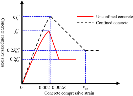 \[\sigma_c = \begin{cases} K f_c' \left[ \dfrac{2\varepsilon_c}{0.002K} – \left(\dfrac{\varepsilon_c}{0.002K}\right)^2 \right], & 0 \le \varepsilon_c \le 0.002K, \\[8pt] K f_c' \left[1 – Z_m(\varepsilon_c – 0.002K)\right], & 0.002K < \varepsilon_c \le \varepsilon_{cu}, \\[8pt] 0.2K f_c', & \varepsilon_c > \varepsilon_{cu}, \end{cases} \label{eq3} \tag{3}\] where \(\sigma_c\) is the compressive stress of concrete; \(\varepsilon_c\) is the compressive strain of concrete; \(f'_c\) is the cylinder compressive strength of concrete, taken as \(79\%\) of the cubic compressive strength; \(K\) is the strength enhancement factor of confined concrete; \(Z_m\) is the slope of the strain-softening branch; \(\varepsilon_{cu}\) is the ultimate compressive strain of concrete; \(\rho_s\) is the volumetric ratio of stirrup; \(f_{yh}\) is the yield strength of stirrup; \(h''\) is the concrete core width (core area width); and \(S_h\) is the spacing of stirrups.
