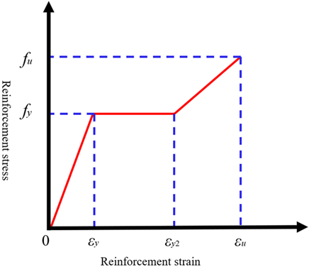 Under dynamic loading conditions, increasing strain rates shorten the yield plateau of reinforcement compared with static loading. In addition, the strain-hardening behavior of reinforcement after yielding plays an important role in governing the mechanical performance of structural members. Therefore, the constitutive model adopted for reinforcement should be capable of accurately describing its post-yield response. In this study, a trilinear elastic-plastic constitutive model with linear hardening is adopted for the reinforcement. This model introduces an ascending branch beyond the yield plateau, enabling an effective representation of the evolution of mechanical behavior after yielding, while maintaining simplicity and computational efficiency. The constitutive relationship of the reinforcement is illustrated in Figure 4, and the corresponding expression [24] is given as follows: \[\label{eq4} \sigma_s= \begin{cases} E_s\,\varepsilon_s, & \varepsilon_s \le \varepsilon_y,\\[2pt] f_y, & \varepsilon_y < \varepsilon_s \le \varepsilon_{y2},\\[2pt] f_y + k\left(\varepsilon_s-\varepsilon_{y2}\right), & \varepsilon_s > \varepsilon_{y2}, \end{cases} \tag{4}\] where \(E_s\) is the elastic modulus of the reinforcement; \(f_y\) is the yield strength of the reinforcement; \(k\) is the strain-hardening ratio and is taken as \(0.01E_s\); \(\varepsilon_s\) is the strain of the reinforcement; \(\varepsilon_y\) is the yield strain of the reinforcement; \(\varepsilon_{y2}\) is the strain at the onset of the strengthening stage; \(\varepsilon_u\) is the ultimate strain of the reinforcement; \(f_u\) is the ultimate strength of the reinforcement.