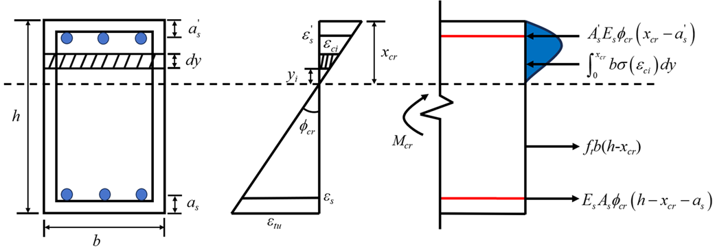 \[\begin{aligned} \label{eq9} M_{cr} &= \int_{0}^{x_{cr}} b\cdot\sigma_c(\varepsilon_{ci}) \left(y_i+\frac{h-x_{cr}}{2}\right)\,dy +(x_{cr}-a_s')\cdot\phi_{cr}\cdot E_s\cdot A_s' \left(x_{cr}-a_s'+\frac{h-x_{cr}}{2}\right) \notag\\ &\quad +(h-x_{cr}-a_s)\cdot\phi_{cr}\cdot E_s\cdot A_s \left(\frac{h-x_{cr}}{2}-a_s\right), \end{aligned} \tag{9}\] where \(A_s\) and \(A_s'\) are the cross-sectional area of tensile and compressive reinforcement, respectively; \(\sigma_c(\varepsilon_{ci})\) is the stress of concrete strip determined from the constitutive model; \(b\) is the section width; \(a_s'\) and \(a_s\) are the effective depth to the tensile and compressive reinforcement, respectively.