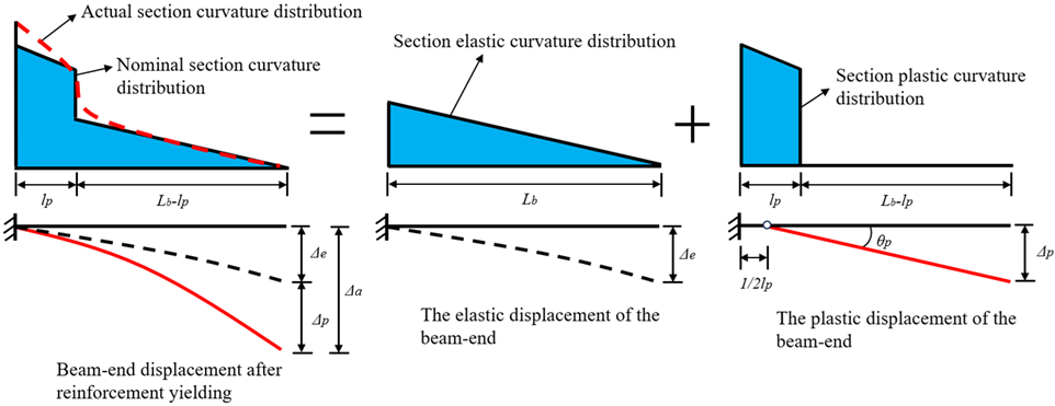 After the reinforcement at the beam-end section corresponding to the maximum bending moment yields, the yielded region gradually expands with increasing external load, eventually leading to the formation of a plastic hinge zone. Within this zone, the sectional curvature increases rapidly, resulting in significant rotational deformation at the beam end and a corresponding increase in displacement. Consequently, the influence of the plastic hinge must be considered in the beam-end displacement \(\Delta_p\) after reinforcement yielding. In this stage, the total displacement consists of both elastic and plastic components, as illustrated in Figure 6.