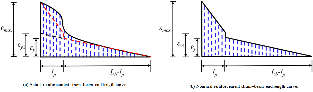 The area enclosed by the strain–length curve represents the length variation. Accordingly, the nominal length increment \(\Delta l\) of the beam can be expressed as: \[\Delta l =\frac{1}{2}\,\varepsilon_y\,(L_b-l_p) +\frac{(\varepsilon_{\max}+\varepsilon_{y1})\,l_p}{2}, \label{eq33} \tag{33}\] where \(\varepsilon_{y1}\) is the nominal yield strain of reinforcement; \(\varepsilon_{\max}\) is the maximum reinforcement strain, \[\varepsilon_{\max}=0.0033\,\frac{(h-a_s-x_u)}{x_u},\] and \(x_u\) is the depth of compression zone at ultimate load.