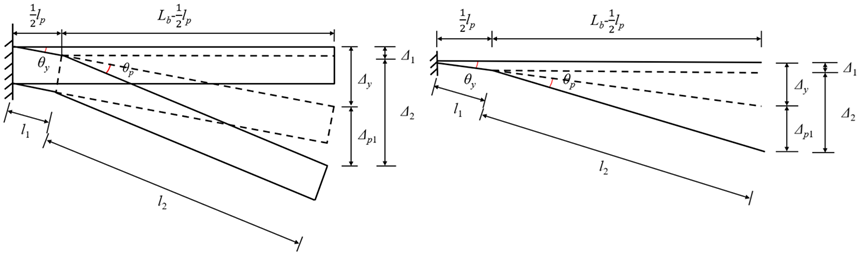The second variation length \(l_2\) is expressed as: \[l_2=\sqrt{\left(L_b-\frac{1}{2}l_p\right)^2+\Delta_2^2} \label{eq35} \tag{35}\] where \(\theta_p\) is the plastic rotation angle, \[\theta_p=l_p(\phi_u-\phi_y), \qquad \Delta_{p1}=\theta_p\left[L_b-\frac{1}{2}l_p\right], \qquad \Delta_2=\Delta_1+\Delta_{p1}-\Delta_1.\]