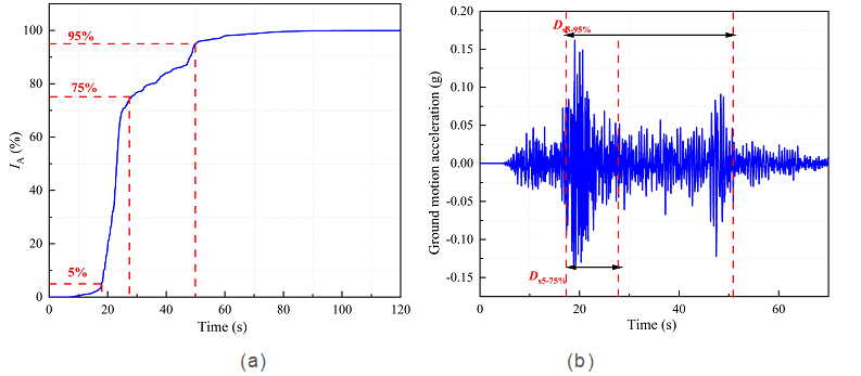 (i) Significant Duration (D\({}_{s}\)). Using the acceleration records collected at the Fatih station during the 1999 Kocaeli earthquake in Turkey as an example [27], the method for determining D\({}_{s}\) is illustrated in Figure 1. The time intervals are taken between different percentages of the cumulative seismic energy relative to the total input seismic energy. Typically, the time interval corresponding to 5%-75% or 5%-95% of the cumulative energy is selected as the significant duration. This cumulative energy can be obtained by integrating the squares of acceleration, velocity, and displacement. The Arias Intensity (I\({}_{A}\)) is used to represent the cumulative energy released by ground motion, and its expression is: \[\label{GrindEQ__1_} I_{{\rm A}} =\frac{\pi }{2{\rm g}} \int _{0}^{t_{\max } }a(t)^{2} dt , \tag{1}\] where a(t) is acceleration history, t\({}_{max}\) is the total duration of the acceleration history, and g is the acceleration due to gravity.