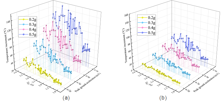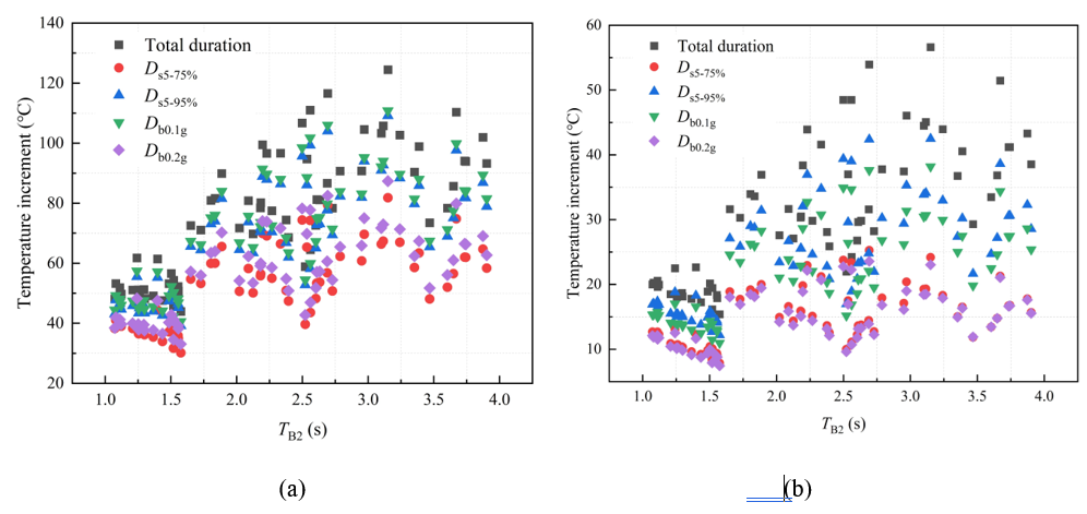 The bracketed duration shows sensitivity to thresholds. For example, the lead core temperature increment under D\({}_{b}\)\({}_{0.2g}\) is much smaller than that under the total duration, while D\({}_{b}\)\({}_{0.1g}\) is closer to the total duration, This behavior occurs because, with an increase in the threshold value, the definition of bracketed duration leads to a reduction in its duration. In other words, the closer the selected threshold is to the PGA, the smaller the bracketed duration becomes. When the threshold value exceeds the PGA, the bracketed duration becomes 0, which means that the ground motion has not yet reached the set strong earthquake duration. Unlike the bracketed duration, the significant duration value is not affected by the size of the PGA, but is bounded by its energy accumulation rate. The two important durations, D\({}_{s}\)\({}_{5-95\%}\) and D\({}_{s}\)\({}_{5-75\%}\), defined by relative thresholds, are generally more stable, but there is a larger difference in energy accumulation during their definition. D\({}_{s}\)\({}_{5-75\%}\) is defined as the stage with the fastest growth rate of energy accumulation, and thus its duration value is slightly smaller than that of D\({}_{s}\)\({}_{5-95\%}\). The LRB heat generation and deformation is a kind of energy accumulation process, and the size of the heat generation is obviously related to the cumulative growth rate of seismic energy, the cumulative amount of heat generation in the time period defined by D\({}_{s}\)\({}_{5-95\%}\) is closest to the result under the total duration compared to D\({}_{s}\)\({}_{5-75\%}\).
