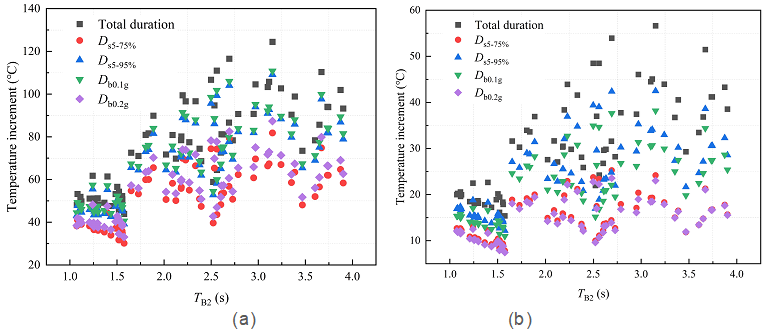 For a specific ground motion record, although the total duration is fixed, the structural seismic response can vary significantly due to the different ways of defining duration indexes [30]. To investigate the effect of different duration indexes on the seismic response of the structure, the temperature increment, characteristic strength degradation rate, peak shear strain, and energy dissipation of the lead core were analyzed for single-bearing isolated structures under different T\({}_{B2}\) values and duration indexes.