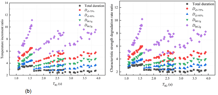 In order to comprehensively investigate the effect of ground motion duration on the seismic response of LRB isolation structures, the characteristic strength reduction rate, lead core temperature increment, shear strain, and energy dissipation of LRB isolation structures with different T\({}_{B2}\) under long- and short-duration ground motions are compared. In order to characterize the effects of long- and short-duration ground motions on LRB deformation and heating, the temperature increment ratio, i.e., the ratio of the temperature increment of the lead core inside the LRB isolation structure under long-duration ground motions to that under short-duration ground motions, is defined to measure the difference in temperature increment between long- and short-duration ground motions, and similar ratios are adopted for the analysis and comparison of the characteristic strength reduction rates, peak shear strains, and energy dissipation.