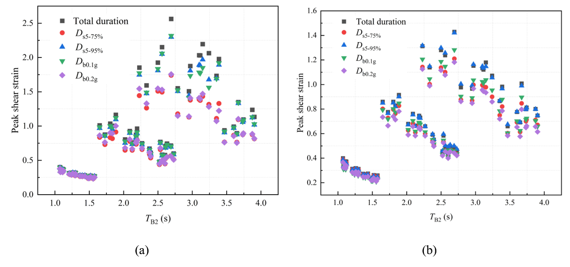 Figures 13 and 14 respectively show the variation in the average values of peak shear strain and energy dissipation in the LRB isolated structure with respect to the variation of T\({}_{B2}\) under different duration indexes. From Figure 13, it can be seen that D\({}_{s}\)\({}_{5-95\%}\) and D\({}_{b}\)\({}_{0.1g}\) are closest to the shear strains under the total duration, i.e., defining the intercepted ground motion records in terms of D\({}_{s}\)\({}_{5-95\%}\) or D\({}_{b}\)\({}_{0.1g}\) reduces the amount of dynamic calculations while allowing more accurate calculation of the shear strains of the LRB isolation structure for different periods. It can also be seen that, whether it is long or short duration, in the range of T\({}_{B2,min}\), each duration index is almost close to the calculated shear strain under the total duration, and the trend of change is also relatively close, that is, for the short period LRB isolation structure, the influence of each duration index on the maximum displacement demand is not obvious, and the influence of the difference between the duration indexes can be disregarded in the range of T\({}_{B2,min}\). For LRB isolation structures in the range of T\({}_{B2,max}\), the effect of duration is significant, so it is necessary to select a suitable duration index to measure the maximum displacement demand of LRB isolation structures.