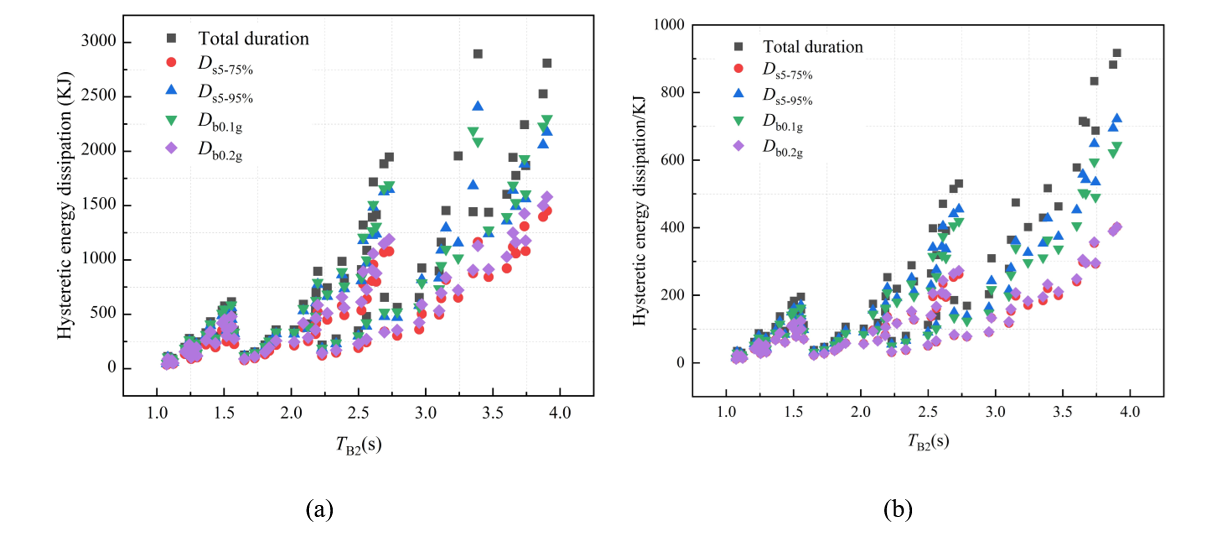 As can be seen from Figure 14, the hysteretic energy dissipation under each duration index is approximately equal in the range of T\({}_{B2,min}\), while the hysteretic energy dissipation of LRB seismic isolation structures under long- and short-duration ground motions increases gradually with the increase of the post-yield period, and the difference between the hysteretic energy dissipation under long- and short-durations becomes bigger gradually, this is due to the fact that the longer duration will make the LRB isolation structure undergo more plastic hysteresis, which will inevitably cause the structure to have greater strength and stiffness degradation, thus causing larger cumulative damage for LRB isolation structures that suffer from the degradation effect. Under the ground motions with D\({}_{s}\)\({}_{5-95\%}\) and D\({}_{b}\)\({}_{0.1g}\) index, the hysteretic energy dissipation of LRB isolation structures is almost the same, and both of them are the closest to the total duration. The hysteretic energy dissipation of LRB isolation structure under D\({}_{s}\)\({}_{5-75\%}\) and D\({}_{b}\)\({}_{0.2g}\) in the long- and short-duration records is also almost the same, but there is a significant difference with the hysteretic energy dissipation under the total duration, i.e., the selection of D\({}_{s}\)\({}_{5-75\%}\) and D\({}_{b}\)\({}_{0.2g}\) indexes will seriously underestimate the hysteretic energy dissipation of LRB isolation structure.