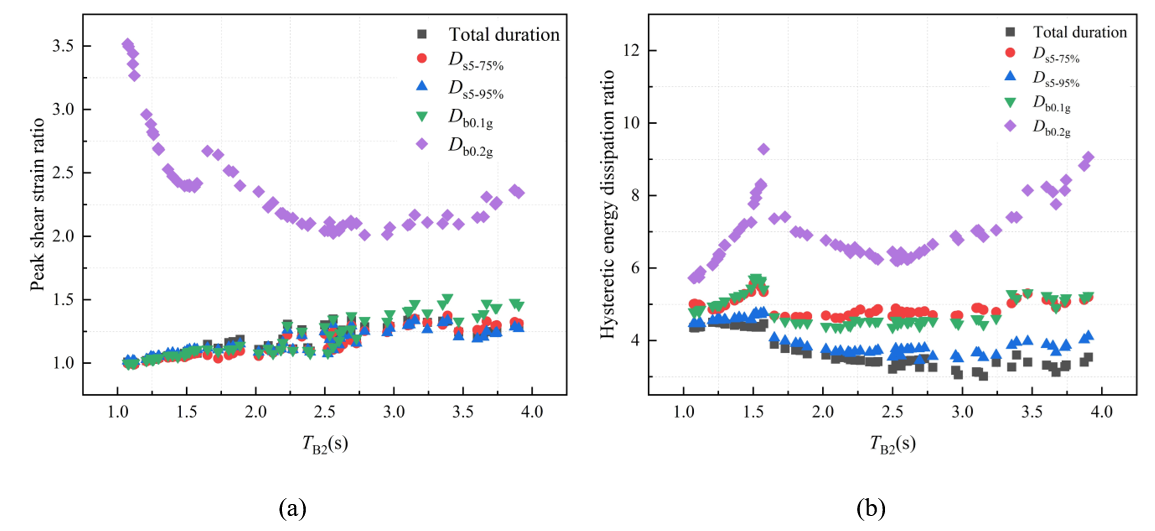 The variation of peak shear strain ratio and energy dissipation ratio of LRB isolation structure with T\({}_{B2}\) under different duration indexes is given in Figure 15. From Figure 15(a), it can be seen that the quantitative difference in the peak shear strain of the LRB isolation structure under long- and short-duration ground motions gradually increases with the increase of the post-yield period. However, the peak shear strain ratio is small compared to the ratio of the temperature increment of the lead core and the rate of reduction of the characteristic strength under the long- and short-duration ground motions and the maximum ratio of about 3.5. In addition, except for D\({}_{b}\)\({}_{0.2g}\), the peak shear strain ratios are approximately the same, and the ratios are between 1 and 1.5 in the whole period range, which indicates that for the LRB peak shear strain, the difference between long- and short-durations is small, and the error due to the way of defining different duration indexes can be approximately ignored when taking the significant duration or D\({}_{b}\)\({}_{0.1g}\). From Figure 15(b), it can be seen that the hysteretic energy dissipation ratio under D\({}_{s}\)\({}_{5-95\%}\) is closer to the result under total duration, while the difference between the hysteretic energy dissipation ratio under D\({}_{b}\)\({}_{0.2g}\) and that under total duration is the largest. This indicates that for LRB hysteretic energy dissipation, taking the significant duration or D\({}_{b}\)\({}_{0.2g}\) will bring larger errors, and it is recommended to choose D\({}_{s}\)\({}_{5-95\%}\) to reflect the effect of duration on LRB hysteretic energy dissipation.