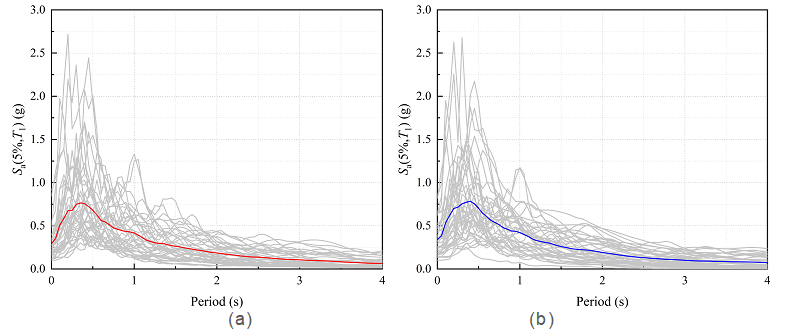 Typically, shallow seismic events have shorter duration characteristics, while subduction zone seismic events have longer durations characteristics [28]. According to the different durations characteristics of seismic events, ground motions can be classified into long- and short-duration ground motions. Current research does not agree on the thresholds for the delineation of long- and short-duration ground motions records, which should be chosen to be sufficiently long to result in a significant non-linear response of the structure, but at the same time it should be noted that too long a threshold will result in too few ground motion records to choose from. Therefore, 25s is used as the threshold for delineating long- and short-duration ground motions [29]. Since the magnitude of ground motion duration varies with the duration index, the robustness of the ground motions duration index needs to be considered. Among the four types of ground motion duration indicators mentioned above, the significant duration does not vary with the amplitude of the ground motion and shows no obvious correlation with peak ground acceleration (PGA), peak ground velocity (PGV), or the spectral acceleration corresponding to the fundamental period of the structure, S\({}_{a}\)(T\(_1\)). It exhibits good robustness, and the significant duration D\({}_{s}\)\({}_{5-75}\)\({}_{\%}\) has been widely applied in practical research [30]. Therefore, D\({}_{s}\)\({}_{5-75}\)\({}_{\%}\) is selected in this study as the indicator for distinguishing between long and short ground motion durations. Ultimately, two sets of ground motion records are chosen, one representing long-duration motions and the other representing short-duration motions, with 40 records in each set.