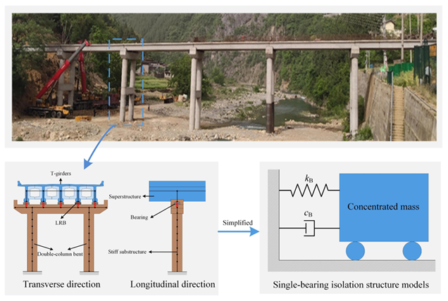 In order to effectively evaluate the seismic performance of the isolated bridge, Kunde et al. modeled the isolated bridge as a single-degree-of-freedom isolated structure (considering the bridge pier and superstructure as rigid), which can effectively obtain the seismic response of the isolation bearings [31]. Dicleli et al. and Ozdemir et al. also used a similar modeling approach to analyze the isolated bridge [32, 33]. In this paper, the structural form is simplified to a single-bearing isolation structure model composed of the superstructure and the LRB (Figure 4) by assuming that the bridge pier is rigid in order to effectively track the seismic response of the LRB.