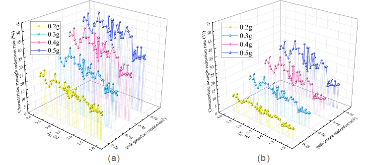 Figures 5 and 6 compare the variation in the mean values of lead core temperature increment and characteristic strength reduction rate of LRB isolation structures under the long- and short-duration ground motions with T\({}_{B2}\), respectively. It can be seen that the results of lead core temperature increment and characteristic strength reduction rate under the long-duration ground motions are larger in the range of T\({}_{B2,max}\) than in the range of T\({}_{B2,min}\). This is due to the fact that in the T\({}_{B2,min}\) range, the stiffness of the LRB isolation structure itself is larger, so that it is mostly in an un-yielded state in an earthquake, max range has a smaller stiffness and is more prone to reciprocating shear deformation, with the result that the lead core produces more plastic deformation and heat accumulation. At the same time, the increase in lead core temperature also leads to a decrease in the characteristic strength of LRB isolation structure, the lead core temperature increment and characteristic strength reduction rate of LRB isolation structure are extremely sensitive to the intensity of ground motions, with the peak acceleration of ground motions from low to high, the lead core temperature increment and the corresponding phenomenon of characteristic strength reduction are also more obvious, and the impact of long-duration ground motions on the temperature of the lead core is greater, which is manifested in the temperature increment and characteristic strength reduction rate is much larger than that of short-duration ground motions.
