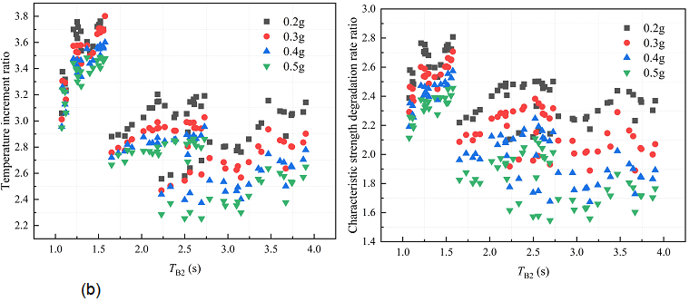 Figure 7 compares the variation of the lead core temperature increment ratio and the characteristic strength degradation rate ratio of the LRB isolated structure under long-duration and short-duration ground motions with respect to T\({}_{B2}\). It can be seen that the temperature increment under long-duration is 2.25 to 3.8 times of that under short-duration, while the characteristic strength reduction rate is 1.55 to 2.8 times. And in the period range of the selected bearing, the ratio of lead core temperature increment and the ratio of characteristic strength reduction rate under ground motions at long-duration time do not have a linear correspondence with the post-yield period, and they show distinct partitions in the range of T\({}_{B2,max}\), T\({}_{B2,min}\) and T\({}_{B2,mid}\), which is mainly related to the different rubber thicknesses of different types of bearings. With the increase of T\({}_{B2}\), the distribution of temperature increment ratio and characteristic strength reduction rate ratio under different ground motions intensities gradually becomes decentralized from centralized, which indicates that the effect of ground motions intensity on the temperature increment and characteristic strength reduction rate under long- and short-duration ground motions is small in the range of T\({}_{B2}\),min, and with the increase of T\({}_{B2}\), the effect of ground motions intensity on the temperature increment and characteristic strength reduction rate under long- and short-duration ground motions becomes more and more significant.