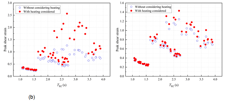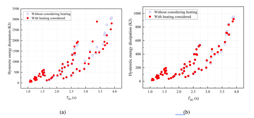 Existing studies have shown that the lead core heating makes the maximum shear deformation demand of the bearing increase significantly [34], and Shirazi found that the energy dissipated per cycle (EDC) of the bearing is the main factor leading to the increase of the bearing temperature through a large number of experiments [35], and the heat mainly originates from the hysteretic deformation of the lead core. The variation of peak shear strain and average value of hysteretic energy dissipation with T\({}_{B2}\) for LRB isolated structures under long- and short-duration ground motions is shown in Figures 8 and 9, respectively. From Figure 8, it can be seen that in the range of T\({}_{B2,min}\), the peak shear strain of the bearing when the lead core heating is considered does not differ much from the result without consideration, and the maximum difference of peak shear strain is 9.43%. As the cycle increases, the amplification of peak shear strain by lead core heating becomes more and more obvious, and the maximum difference in peak shear strain is 112%. The maximum shear deformation demand of the LRB isolation structure considering the lead core deformation heat generation under long-duration ground motions increases significantly. As can be seen in Figure 9, the effect of lead core heating on the energy dissipation of the LRB is small. In the range of T\({}_{B2,min}\), due to the large stiffness of the isolation structure, the bearing has not yielded yet, and the consideration of lead core heating or not has little effect on the energy dissipation, whereas in the range of T\({}_{B2,max}\), the gap in energy dissipation begins to appear, and the gap widens with the increase of T\({}_{B2}\). This is due to the fact that the long-duration ground motions makes the LRB isolation structure experience more times of plastic hysteresis, and for seismic isolation structures considering degradation of LRB performance due to lead core heating, its strength and stiffness degradation is more serious, which results in a larger cumulative damage.