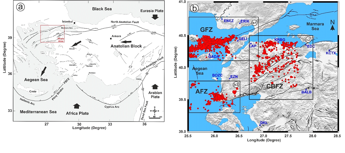 In the southwest of the peninsula, the tectonic regime becomes extensional. The Ayvac\(\mathrm{\imath}\)k Fault Zone within this region consists of stepped normal faults trending NE-SW and NW-SE (Figure 1b3). The 2017 Ayvac\(\mathrm{\imath}\)k earthquake, which exhibited long-lasting aftershocks and caused numerous earthquakes, is associated with this extensional system. The intense geothermal activity, hot springs, and hydrothermal alteration zones in the region indicate high fluid pressure and temperature in this part of the crust [26]. This plays a decisive role in the region’s weak crustal structure and the attenuation characteristics of seismic waves.