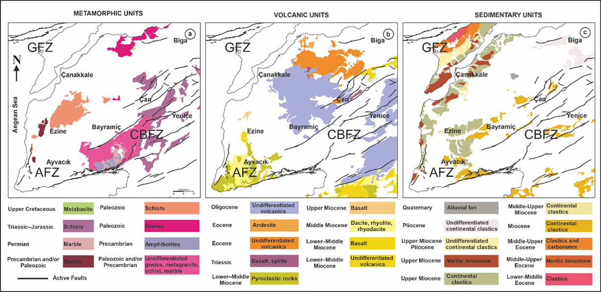 In addition to these sedimentary covers, the most prominent volcanic units are distributed around the Ayvac\(\mathrm{\imath}\)k and Çan-Biga Fault Zones, highlighting the strong tectonic control on magmatic activity. In contrast, the volcanic activity around the Çan-Biga Fault Zone is characterized by older, extensive Eocene and Oligocene volcanic suites (Figure 2c), Lower-Middle Miocene basalts form the foundation, which are successively overlain by Middle Miocene dacite, rhyolite, and rhyodacite flows. This intermediate to felsic volcanic sequence is, in turn, capped by a package of Lower-Middle Miocene pyroclastic rocks. In contrast, around the Çan-Biga Fault Zone, extensive areas of Eocene and Oligocene volcanic rocks are evident (Figure 2c).
