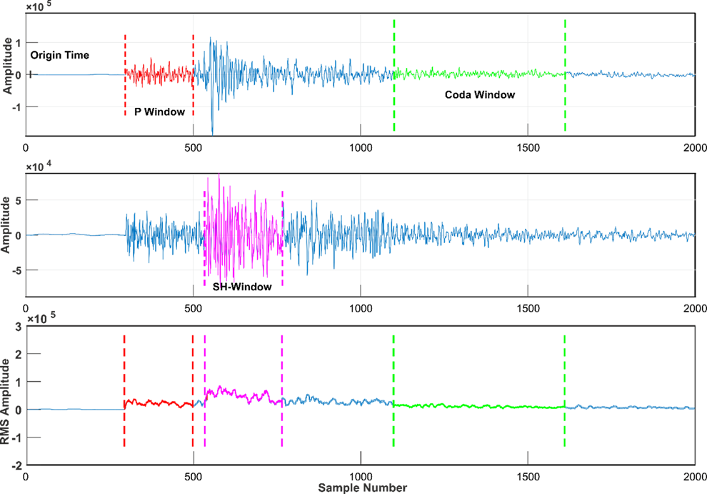 For the direct P and S phases, spectral amplitudes (Ap(f, r) and As(f, r)) were obtained from the peak-to-peak measurements within a 2.048-second window. The coda spectral amplitude (Ac(f, tc)) was calculated as the root-mean-square (RMS) amplitude on the horizontal component with 5-sec window lengths (Figure 3). Consistent with established practice (e.g. [29]), we confirmed through comparative analysis that results from a single horizontal component were statistically robust. the spectral amplitudes of the body waves undergoing the normalization procedure are shown as: \[\label{GrindEQ__2_} \frac{A_{s,p}(f)}{A_c(f,t_c)}=\frac{R_{\varphi}\varnothing S_{s,p} (f) r^{\gamma} e^{-\left(\frac{\pi f r}{Q_{s,p}(f) V_{s,p}}\right)}G(f) I(f)} {S_s P(f,t_c) G(f) I(f)}. \tag{2}\]