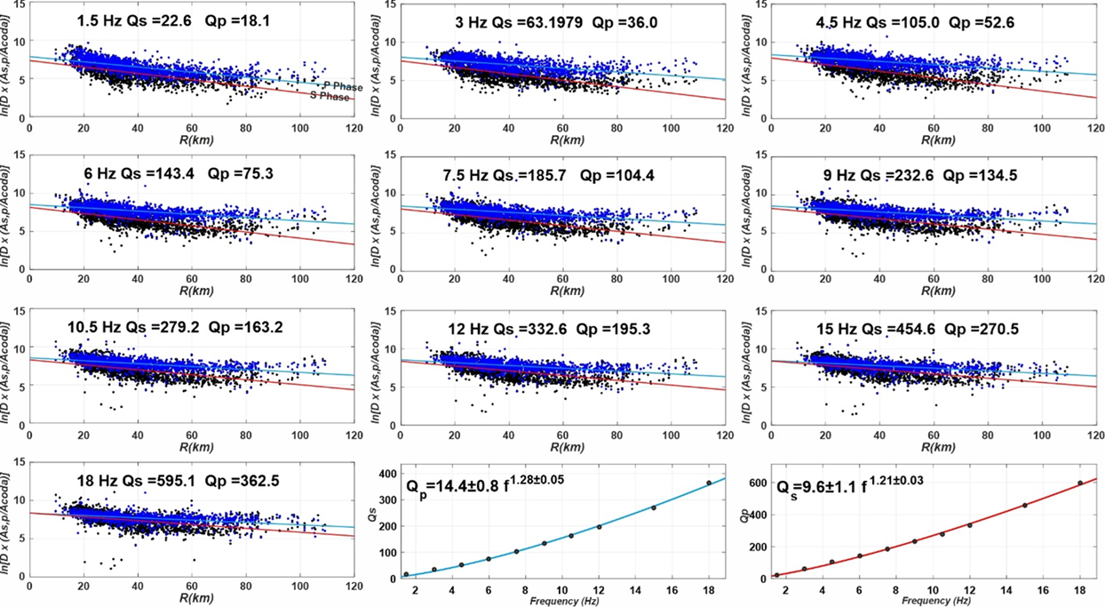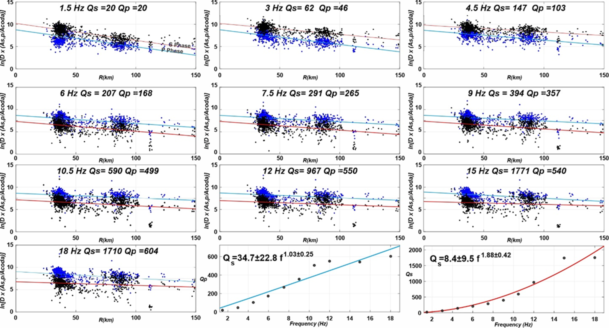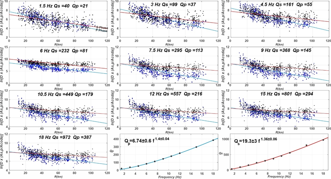 Consequently, the vertical component was used for Qp analysis and the East-West component for Qs analysis. The quality factors of Qp and Qs were derived from the relationship: \[\label{GrindEQ__3_} \ln\!\left\{ \frac{R_{\varphi}\,\phi^{-1}\,A_{s,p}(f,r)\,r^{\gamma}} {A_c(f,t_c)} \right\} = -\frac{\pi f r}{V_{s,p}\,Q_{s,p}(f)} +\mathrm{cnst}(f), \tag{3}\] where r is the hypocentral distance, V\(_{s,p\ }\)is the average crustal velocity for the respective wave type, \(\gamma\) is the geometrical spreading exponent, and cnst(f) is a frequency-dependent constant. The geometrical spreading term was modeled as r\(^{-1}\) for distances less than twice the Moho depth, estimated to be \(\mathrm{\sim}\)45 km for the region [30]. For larger distances, the form (r.h.m)\(^{-0.5\ }\)was adopted, in accordance with models for regional wave propagation [10]. For each central frequency expressed in Table 1, Qp(f) and Qs(f) were determined by performing a linear regression of the right-hand side of Eq. (1) against epicentral distance r. The slope b of the best-fit line is related to the quality factor by: \[\label{GrindEQ__4_} b=\frac{\pi f r}{V_{s,p}\,Q_{s,p}(f)}. \tag{4}\]