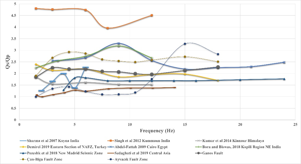 Studies focusing on the Qs/Qp ratio provide critical insights into the physical characteristics of the crust during seismic wave propagation. In this context, the results obtained in this study are consistent with values reported at the global scale. Numerous studies conducted in different regions indicate that S waves are generally less attenuated than P waves, resulting in Qs/Qp ratios predominantly greater than 1 (Figure 7). For instance, ratios exceeding 1 in the Kanto Basin, Japan, point out the role of crustal heterogeneity and scattering. Similarly, studies by Zaretan et al. [33] on Qeshm Island, Iran, as well as Sharma et al. [9] and Singh et al. [34] in India, emphasize the influence of fluids and multiple fracture systems, further supporting this observation and the finding that S waves exhibit higher quality factors (Table 3) In the Marmara Region, Horasan and Boztepe_Güney [20] reported Qs/Qp ratios approaching 2 in certain subregions, reflecting intense scattering processes associated with active tectonics. In this study, the Qs/Qp ratios for the Biga Peninsula were estimated as \(\mathrm{\sim}\)1.63 for the Ayvac\(\mathrm{\imath}\)k Fault Zone, \(\mathrm{\sim}\)2.10 for the Ganos Fault Zone, and \(\mathrm{\sim}\)2.58 for the Çan–Biga Fault Zone, indicating the strong influence of contrasting tectonic regimes (strike-slip versus pull-apart) and geological conditions on seismic attenuation. The comparative plot in Figure 7 illustrates the frequency-dependent variation of these ratios and their relationship with results from different geological environments. Figure 7 also includes Qs/Qp ratios reported in previous studies from different tectonic environments (e.g., Abdel-Fattah, 2009 [35]; Bora and Biswas, [36]; Pezeshk et al. [37]; Sedaghati et al.[38]).The Biga Peninsula data exhibit characteristics comparable to those observed in fractured and sedimentary settings, marked by relatively high Qs/Qp values, while also showing similarities with trends reported from geothermal and volcanic regions at specific frequency ranges. These observations confirm that the Qs/Qp ratio not only reflects differences in seismic wave propagation but also provides reliable information on fracture density, fluid content, thermal conditions, and the current tectonic regime of the crust.